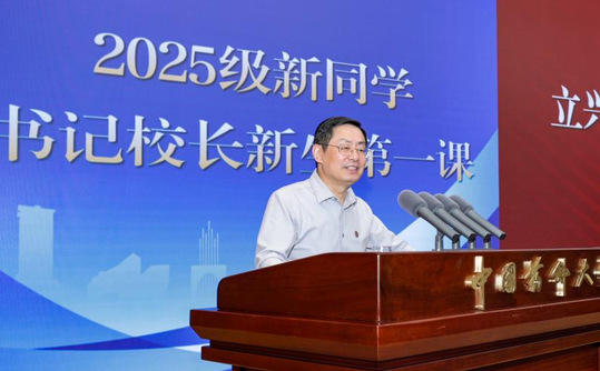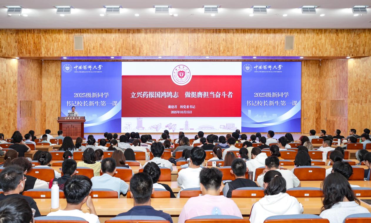 戴建君解读了“精业济群”校训的精神内涵,回顾了抗战时期学校西迁办学的艰辛历程,生动讲述了以徐国钧院士、彭司勋院士为代表的老一辈中国药大人的家国情怀和科学家精神,强调药学人必须坚守“心术正、品质高、志向远”的职业操守。戴建君还通过孙飘扬、章臣桂等杰出校友的事迹,勉励新生以研发普惠良药为己任,切实服务人民健康需求。